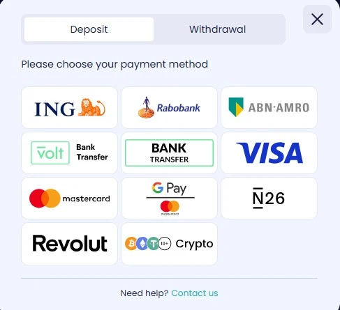 | Betaalmethoden | Volt, ING, Visa, MasterCard, Google Pay, Revolut, Bankoverschrijving, Bitcoin, Ethereum, Tether |