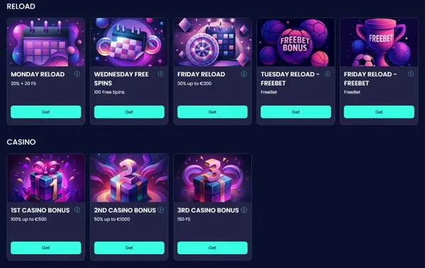 Je eerste drie stortingen kunnen drie aparte beloningen ontgrendelen. De eerste storting is een matchbonus: stort €30 of meer en je krijgt 100% extra tot €500. De tweede storting voegt een bonus van 50% tot €1.000 toe, opnieuw met een minimum van €30. De derde storting is gericht op spins: stort minimaal €30 en ontvang 150 free spins, waarbij winsten onder inzetvereisten vallen. Elke matchbonus heeft een bonusrondspeelvoorwaarde van 40x en winsten uit free spins hebben een inzetvereiste van 35x.